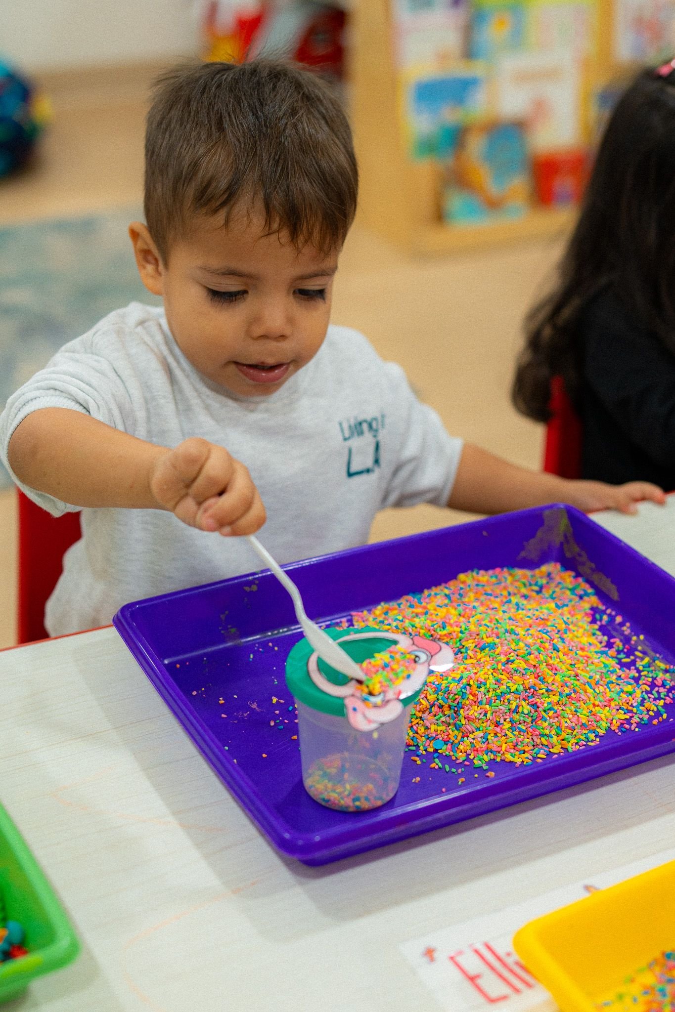 Our Busy Bees had an exciting and colorful adventure with a hands-on activity called “Feeding the Animals!” Each child received their own vibrant tray filled with colorful sprinkles, a spoon, and a variety of adorable animal cups. The challenge? To carefully scoop up the sprinkles and “feed” the animals by placing them into the small openings which were little mouths! At first glance, this may have seemed like simple fun, but this activity was actually helping our preschoolers develop important early learning skills. As they scooped, balanced, and poured, they strengthened their fine motor muscles—essential for future writing and self-care tasks like buttoning and zipping. They also practiced patience, hand-eye coordination, and focus as they worked carefully to complete their feeding challenge.
